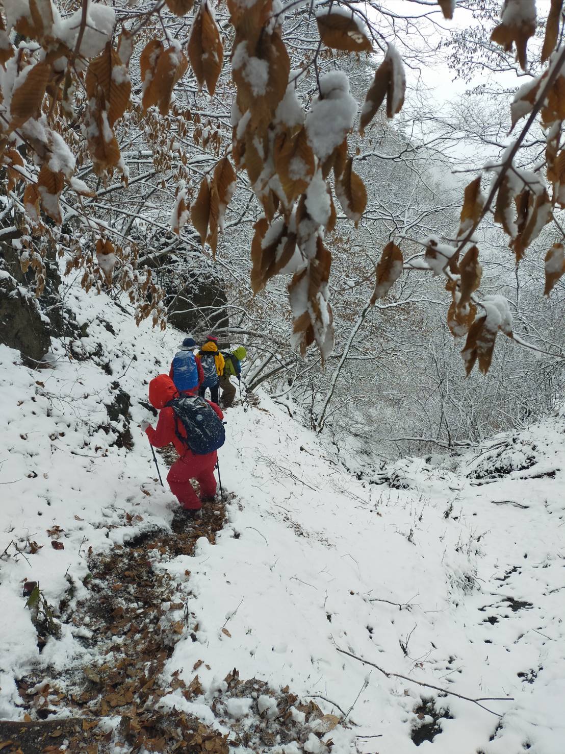 | コメント | 信州の妙義山と云われ鋸歯状の稜線を持つ独鈷山は、雨乞いの山である。別所温泉の南に位置する。土曜日の割には高速道が空いていて3時間で登山口に到着。 信州に入って雪景色が広がっていたので、もしやと思った通り山は雪に覆われていた。 曇り予報が外れ小雪舞う中出発。西前山コースは標高差約700m、登り100分。急登の上の枯葉の上に雪が積り、滑らないよう一歩一歩慎重に登る。5合目近くまで湯ノ沢に沿ったルートで水源を過ぎると更に勾配が増し、狭いトラバースや大岩を巻いたりと緊張の連続。予定より少しオーバーしたが無事山頂到着。雪の中先着が一組。今回は北アルプスや浅間の絶景はお預け。下りは上りのコースは危険と判断し、南に延びる宮沢コースに変更。ジグザグの急な下りが4、50分続いたが、御屋敷沢沿いに出ると道は緩やかになり、緊張が一気にほぐれていくようだった。全員無事下山に万歳。 今年初めての美しい樹氷の雪景色に、緊張を強いられた山行がより印象深いものとなった。 |