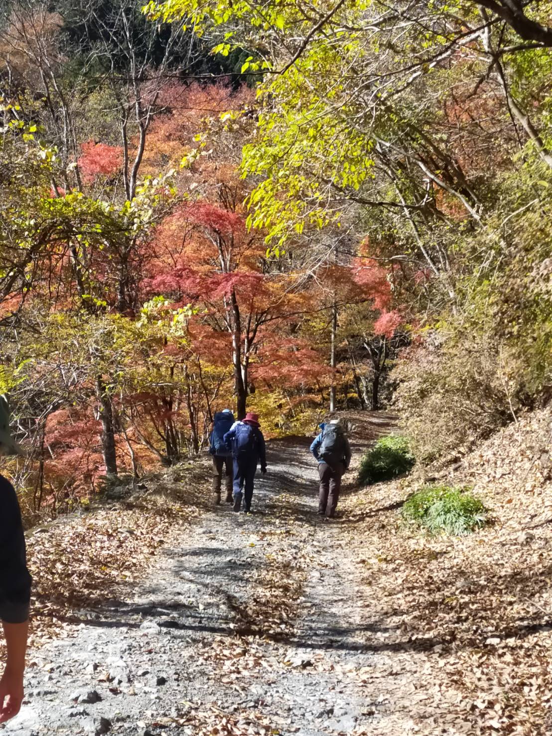 | コメント | 1日目 晴 バスの車窓からは秋も半ば過ぎか、の感じで奥多摩湖は水が少ない。林道を川沿いに進む程に水は白波を立て、渓谷の趣きになっていく。赤いもみじが目を引く。2時間半程、林道を歩いてようやく山道に入り、木の合間から今晩の三条の湯の小屋が見えてきた。 2日目 うす曇り 厚い落葉に覆われて、見えない細い道を音を立てながら、又、葉をはるか下の沢に向って落としながら進む。途中、窪みをつなぐ橋が半分なくなっていた所では、ついていたザイルで慎重に通過した。 やがてゆるやかな斜面のサオラ峠に到着。 晩秋の趣きだ。唐松の落葉の尾根を進むと真新しくはないが、数本のくっきりとした熊の爪跡のついた木を見つけ、更に周囲に目を配りながら進んだ。唐松の子供の小さな木が密生し、広々とした丹波天平に到着。少し遠くの日だまりに猿が数頭いるのがわかり、そこを避けて昼食。 その後は杉の暗い道を下り、やがてぶ厚い落葉の斜面の細い道を行き、廃屋となった作業場や民家などを目にしてバス停にたどりついた。 |